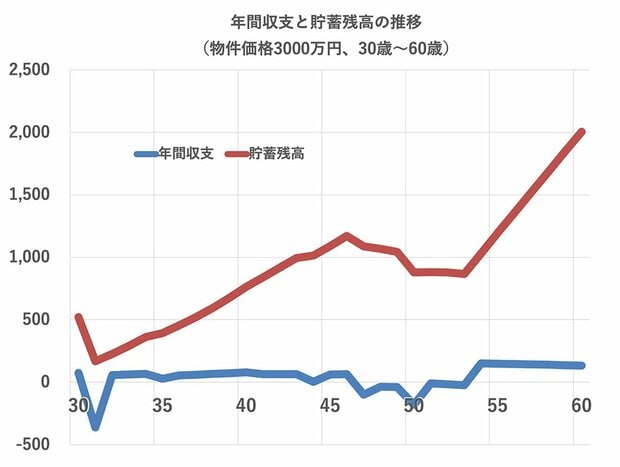 下記に、3000万円の物件を購入した場合の、年間収支と貯蓄額をグラフにした。