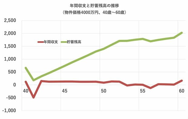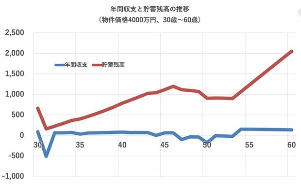 下記に、4000万円の物件を購入した場合の、年間収支と貯蓄残高をグラフにした。