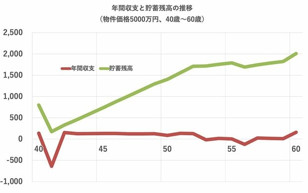 下記に、5000万円の物件を購入した場合の、年間収支と貯蓄残高をグラフにした。