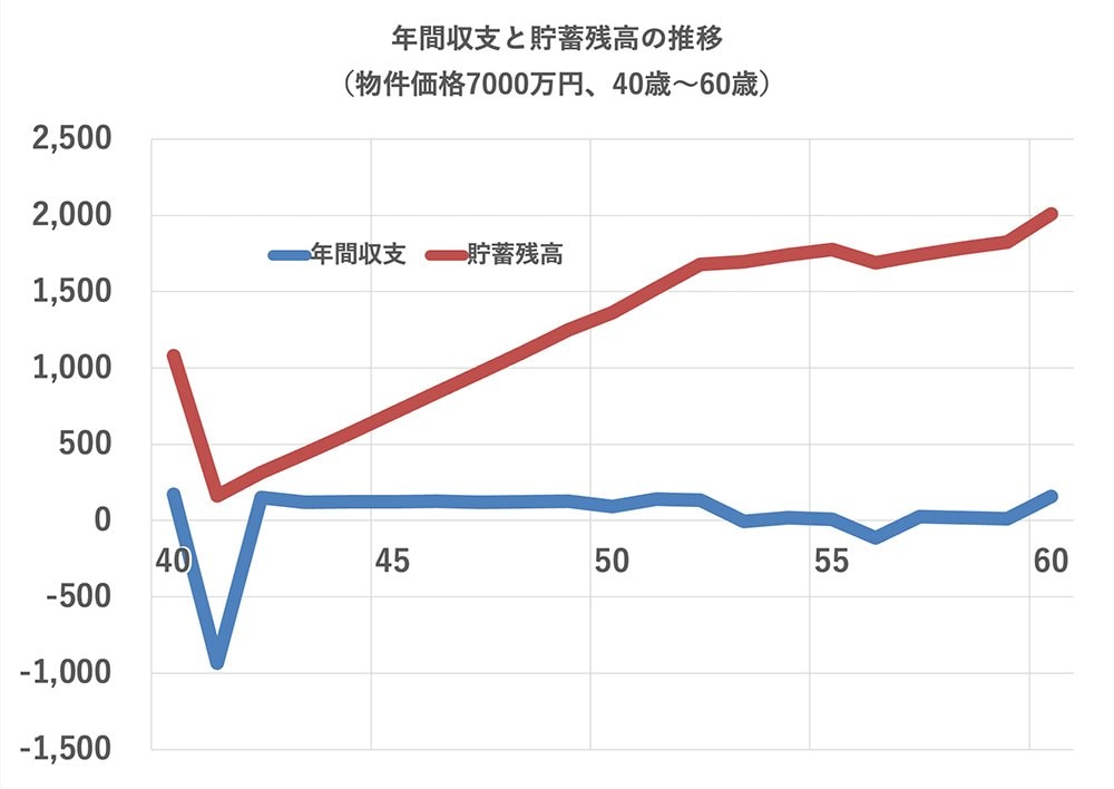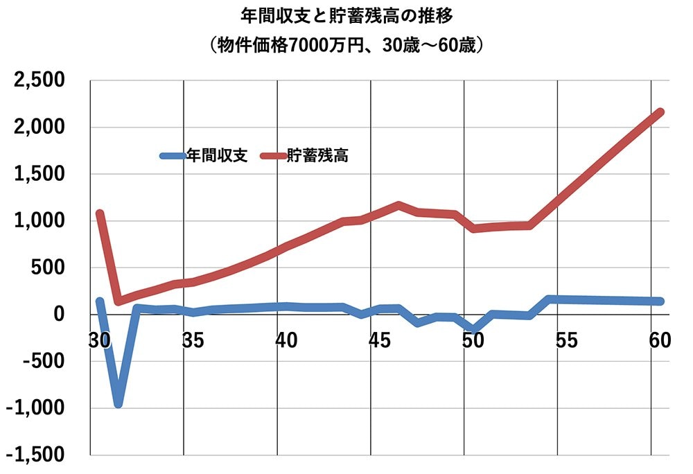 また、以下は7000万円の物件を購入した場合の「年間収支」と「貯蓄残高」のグラフだ。