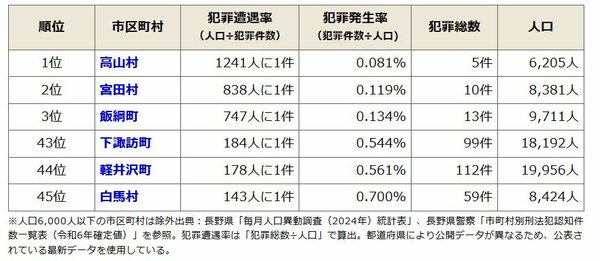治安が良かった市区町村の1位は高山村、2位は宮田村、3位は飯綱町だった。
