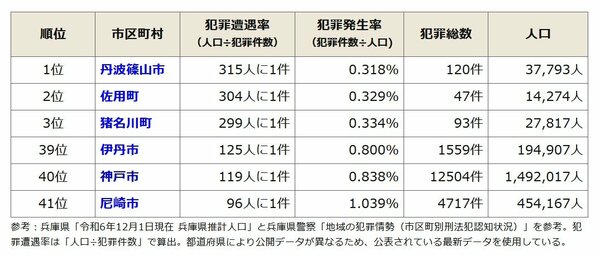 兵庫県の治安ランキングの上位と下位の市区町村は以下の通りだ。