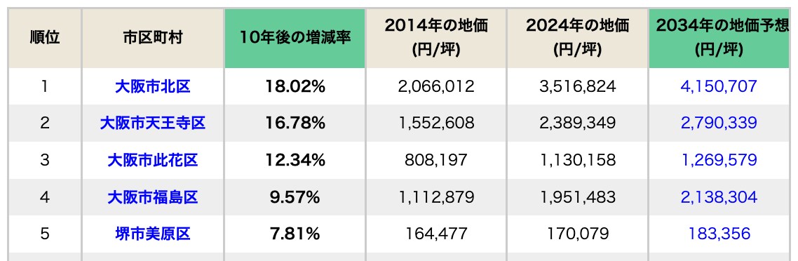 大阪府の10年後の地価上昇率ランキング1位は大阪市北区