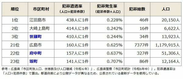 広島県の治安ランキングの上位と下位の市区町村は以下の通りだ。