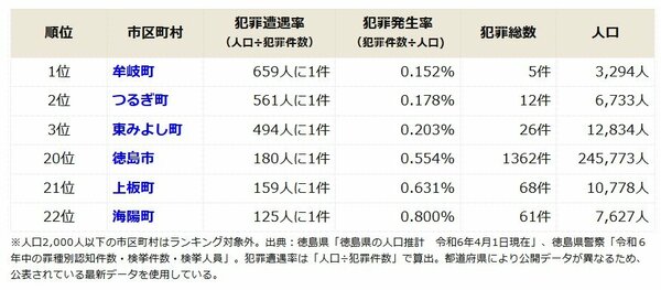 徳島県の治安ランキングの上位と下位の市区町村は以下の通りだ。