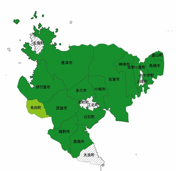 佐賀県で治安が良い市区町村はどこなのか。公的データをもとに、市区町村の治安ランキングを作成した。下記の地図は、犯罪遭遇率に基づき色分けしたもので、治安が良い順に、「白(451人以上に1件)」「黄緑(301人~450人に1件)」「緑(151人~300人に1件)」「赤(0人~150人に1件)」「斜線(ランキング対象外)」で塗り分けた。