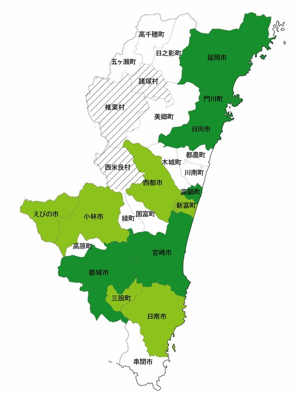 宮崎県で治安が良い市区町村はどこなのか。公的データをもとに、市区町村の治安ランキングを作成した。下記の地図は、犯罪遭遇率に基づき色分けしたものである。治安が良い順に、「白(451人以上に1件)」「黄緑(301人~450人に1件)」「緑(151~300人に1件)」「赤(0人~150人に1件)」「斜線(ランキング対象外)」で塗り分けている。