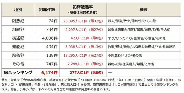 熊本県の治安の「良さ」は全都道府県中8位。全国的に見ると治安が良い県だ。県内では277人に1件の割合で事件が発生している。