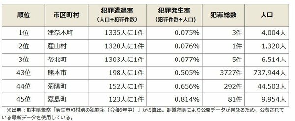 熊本県の治安ランキングの上位と下位の市区町村は以下の通りだ。