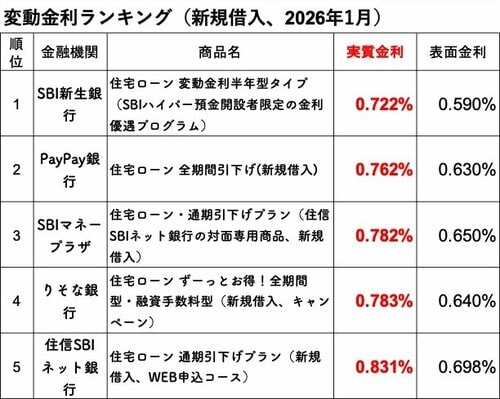 2026年1月の「変動金利(新規借入)」の上位5銀行の住宅ローン金利については、5行が据え置きました。