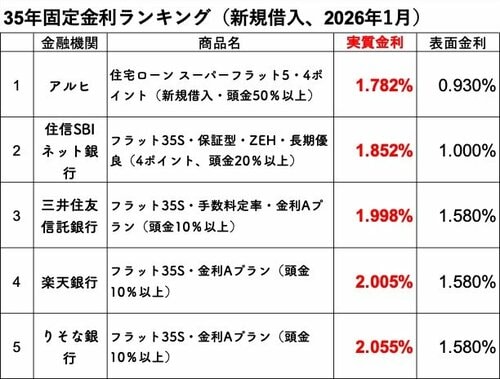 2026年1月の「全期間固定・35年固定金利(新規借入)」の上位5行について、5行が金利を引き上げとしました。フラット35(買取型)の金利は前月から引き上げで、2.080%でした。