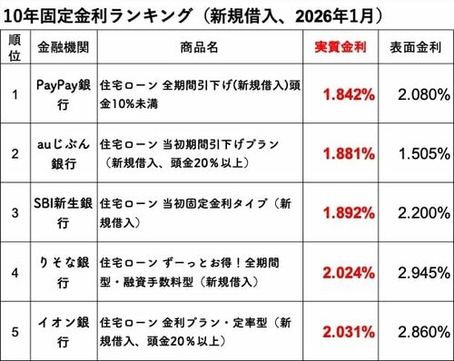2026年1月の上位5銀行の住宅ローンについては、5行が金利を引き上げました。銀行は「10年固定金利」を固定金利選択型の中核に据えていることが多く、激戦区となっています。