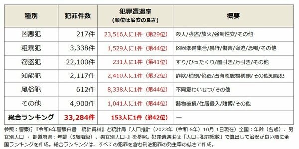 福岡県の治安の「良さ」は全都道府県中42位。全国的に見ると治安が悪い県だ。県内では153人に1件の割合で事件が発生している。