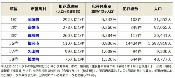 福岡県の治安ランキングの上位と下位の市区町村は以下の通りだ。