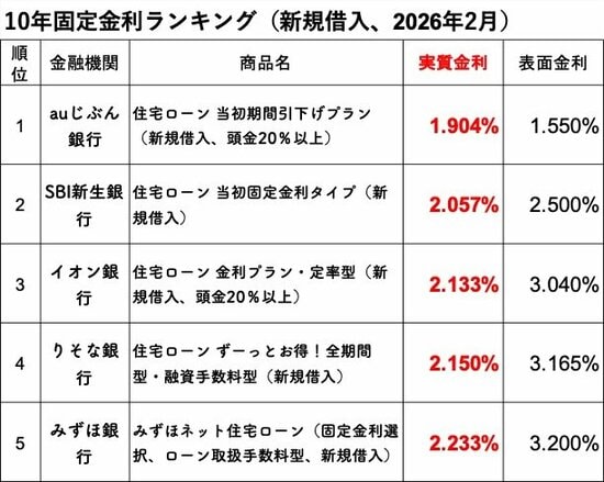 2026年2月の「10年固定金利(新規借入)」実質金利は、auじぶん銀行が1位でした。調査した主要13銀行の住宅ローン金利について、13行が引き上げとしました。
