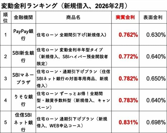 2026年2月の「変動金利(新規・借り換え)」の実質金利ランキングについては、前月に引き続きPayPay銀行がトップとなりました。調査した主要14銀行の住宅ローン金利について、2行が引き上げ、12行が金利を据え置きました。