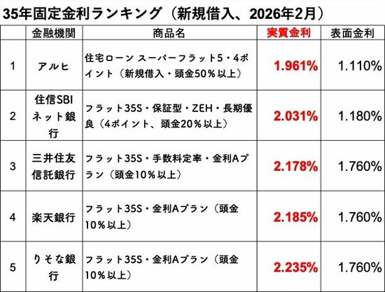 2026年2月は、前月に引き続きアルヒが「全期間固定金利(新規借入)」の実質金利ランキングで1位となりました。また、調査した主要7行の住宅ローン金利(フラット35除く)について、7行が金利を引き上げとしました。