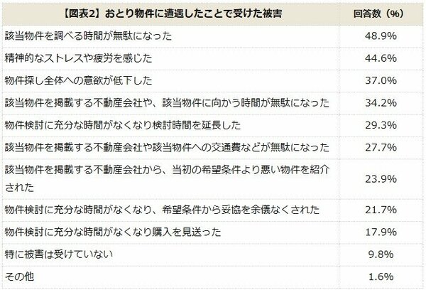 最も多かったのは、「該当物件を調べる時間が無駄になった」の48.9%で、次に「精神的なストレスや疲労を感じた」(44.6%)、「物件探しの全体への意欲が低下した」(37.0%)、「該当物件を掲載する不動産会社や、該当物件に向かう時間が無駄になった」(34.2%)と続いている。