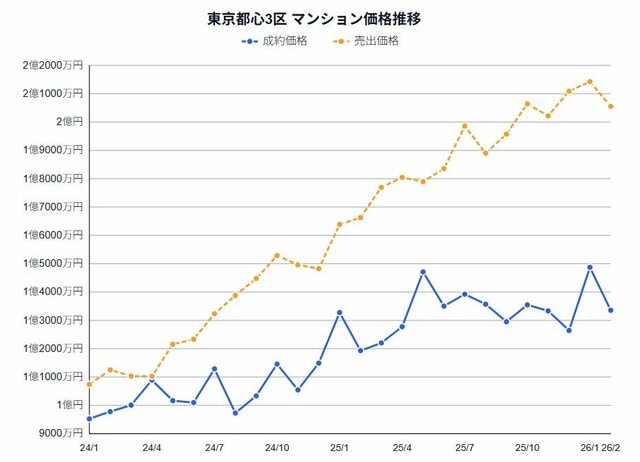 千代田区・中央区・港区の都心3区は、2026年2月の成約価格が1億3354万円(前年比+11.9%)と都内最高水準を維持している。前年同月比では1割超の上昇が続いているが、前月比は-10.2%と大幅に下落した。1月の急騰からの反動だ。売出価格も前月の2億1427万円から2億554万円(前月比-4.1%)に下がっており、高値圏で一息ついた格好となっている。